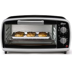With its sleek black finish, silver accents, and subtle curves, this eye-catching toaster oven from Oster offers more than just good looks. The convenient countertop appliance supplies a spacious interior that can toast up to four slices of bread at a time-or be used to bake a veggie casserole, broil fish, and much more. Two manual control dials ensure simple operation. The first dial sets the baking temperature up to 450 degrees F-or position it to Toast mode for toasting or Broil mode for broiling (generates heat from the top element only). The second dial sets the timer up to 30 minutes. It can also be turned to the stay-on position for continuous cooking, as well as be used for choosing the shade of toast, from light to dark. Other highlights include an "on" indicator light, a see-through door for checking on food at a glance, and a stay-cool door handle for safely opening and closing the door. Efficient in both design and performance, the four-slice toaster oven makes a useful addition to any busy kitchen. A handy baking pan comes included.